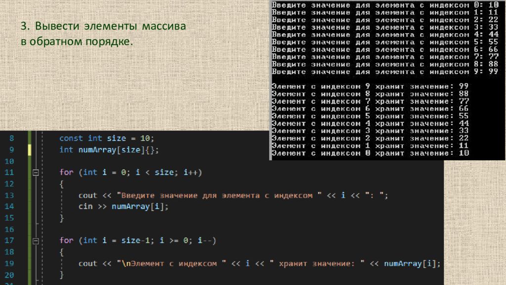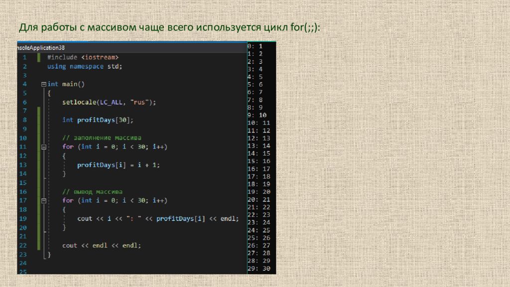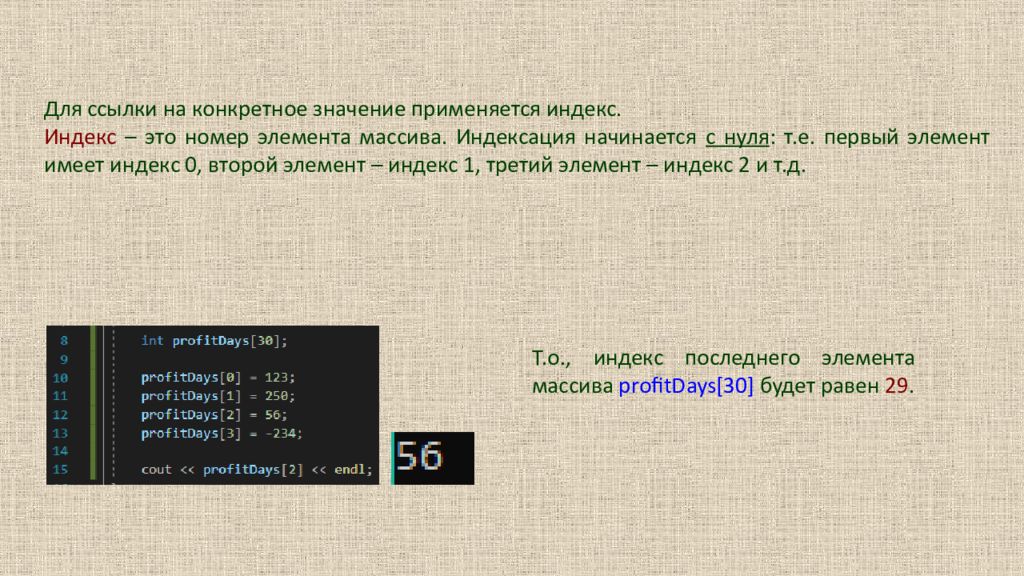 Для ссылки на конкретное значение применяется индекс. Индекс – это номер элемента массива. Индексация начинается с нуля : т.е. первый элемент имеет индекс 0, второй элемент – индекс 1, третий элемент – индекс 2 и т.д. Т.о., индекс последнего элемента массива profitDays[30] будет равен 29.