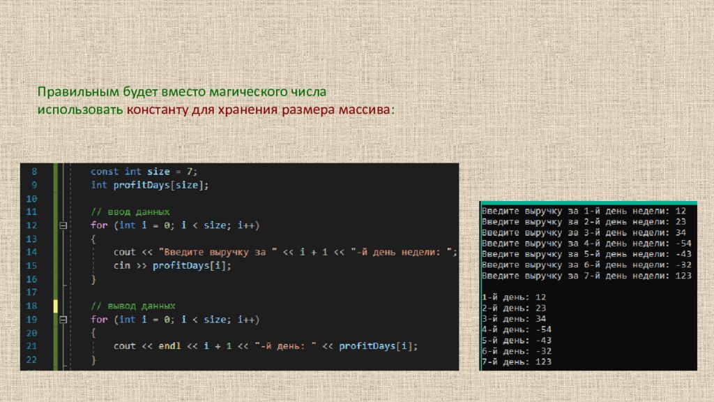 Правильным будет вместо магического числа использовать константу для хранения размера массива :