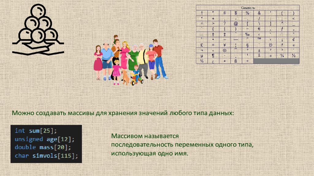 Можно создавать массивы для хранения значений любого типа данных: Массивом называется последовательность переменных одного типа, использующая одно имя.
