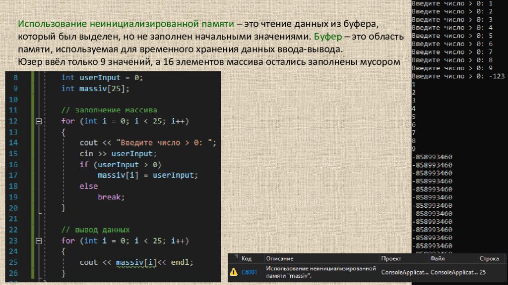 Использование неинициализированной памяти – это чтение данных из буфера, который был выделен, но не заполнен начальными значениями. Буфер – это область памяти, используемая для временного хранения данных ввода-вывода. Юзер ввёл только 9 значений, а 16 элементов массива остались заполнены мусором