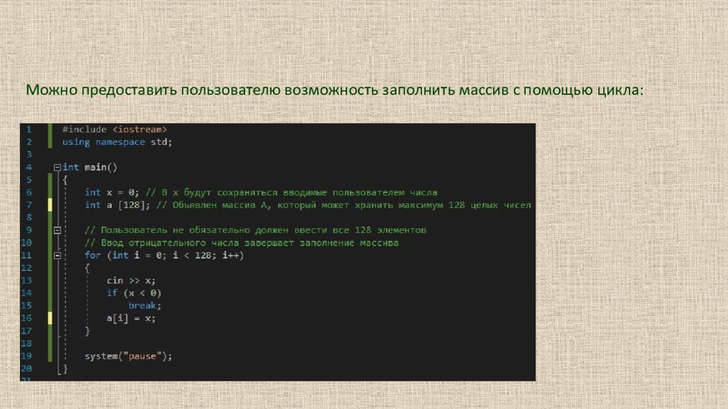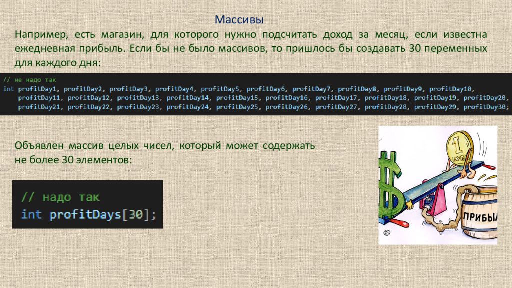 Например, есть магазин, для которого нужно подсчитать доход за месяц, если известна ежедневная прибыль. Если бы не было массивов, то пришлось бы создавать 30 переменных для каждого дня: Объявлен массив целых чисел, который может содержать не более 30 элементов: Массивы