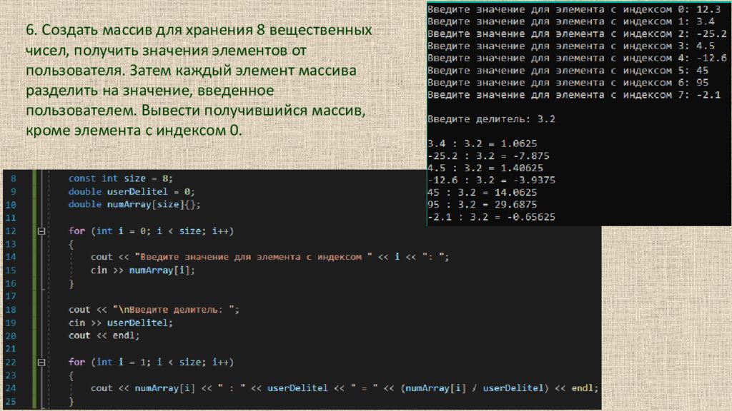 6. Создать массив для хранения 8 вещественных чисел, получить значения элементов от пользователя. Затем каждый элемент массива разделить на значение, введенное пользователем. Вывести получившийся массив, кроме элемента с индексом 0.