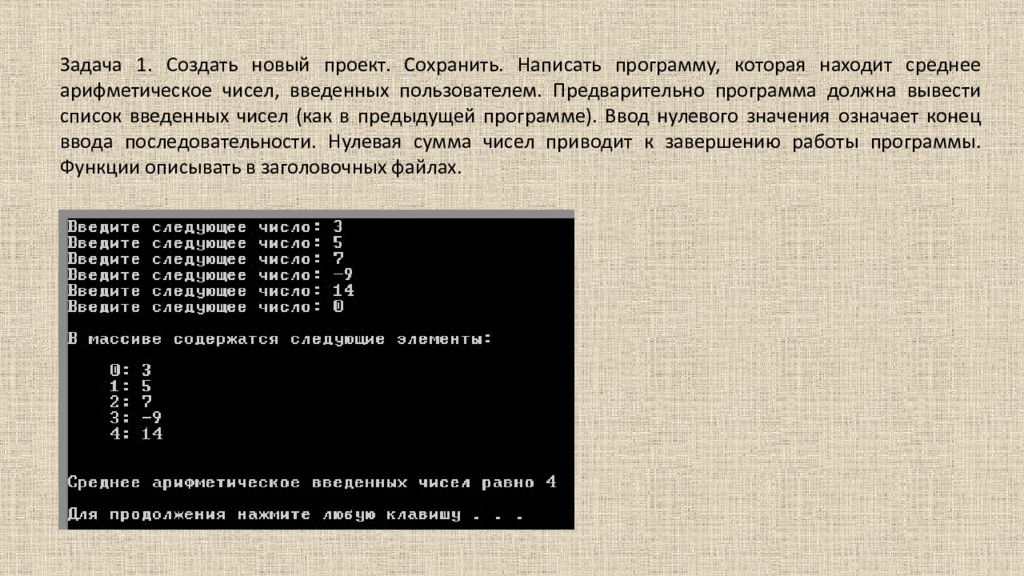 Задача 1. Создать новый проект. Сохранить. Написать программу, которая находит среднее арифметическое чисел, введенных пользователем. Предварительно программа должна вывести список введенных чисел (как в предыдущей программе). Ввод нулевого значения означает конец ввода последовательности. Нулевая сумма чисел приводит к завершению работы программы. Функции описывать в заголовочных файлах.