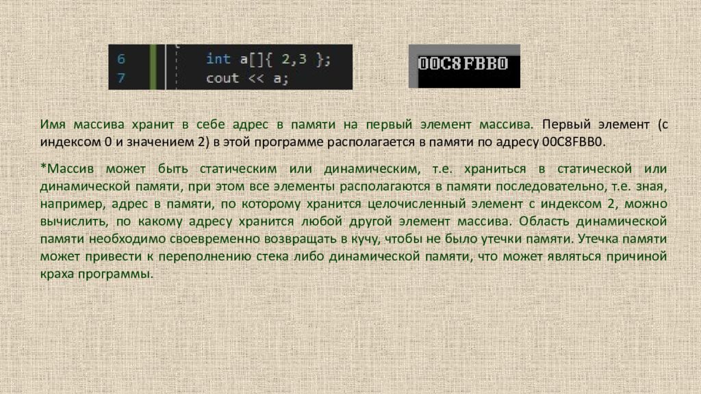 *Массив может быть статическим или динамическим, т.е. храниться в статической или динамической памяти, при этом все элементы располагаются в памяти последовательно, т.е. зная, например, адрес в памяти, по которому хранится целочисленный элемент с индексом 2, можно вычислить, по какому адресу хранится любой другой элемент массива. Область динамической памяти необходимо своевременно возвращать в кучу, чтобы не было утечки памяти. Утечка памяти может привести к переполнению стека либо динамической памяти, что может являться причиной краха программы. Имя массива хранит в себе адрес в памяти на первый элемент массива. Первый элемент (с индексом 0 и значением 2) в этой программе располагается в памяти по адресу 00C8FBB0.