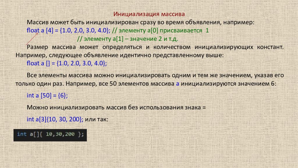 Инициализация массива Массив может быть инициализирован сразу во время объявления, например: float a [4] = {1.0, 2.0, 3.0, 4.0}; // элементу a[0] присваивается 1 // элементу a[1] – значение 2 и т.д. Размер массива может определяться и количеством инициализирующих констант. Например, следующее объявление идентично представленному выше: float a [] = {1.0, 2.0, 3.0, 4.0}; Все элементы массива можно инициализировать одним и тем же значением, указав его только один раз. Например, все 50 элементов массива a инициализируются значением 6: int a [50] = { 6 }; Можно инициализировать массив без использования знака = int a[3]{10, 30, 200}; или так: