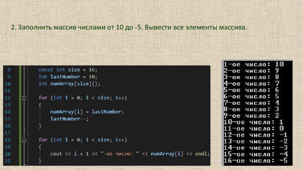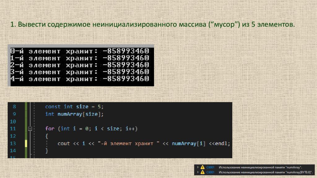 1. Вывести содержимое неинициализированного массива ( “ мусор ” ) из 5 элементов.