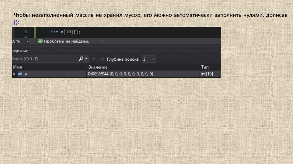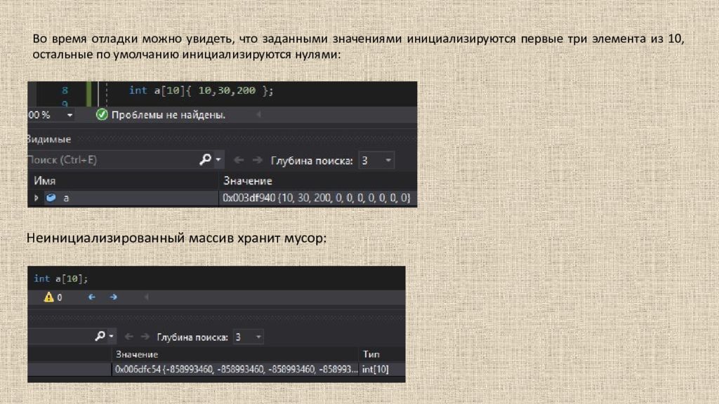 Неинициализированный массив хранит мусор: Во время отладки можно увидеть, что заданными значениями инициализируются первые три элемента из 10, остальные по умолчанию инициализируются нулями: