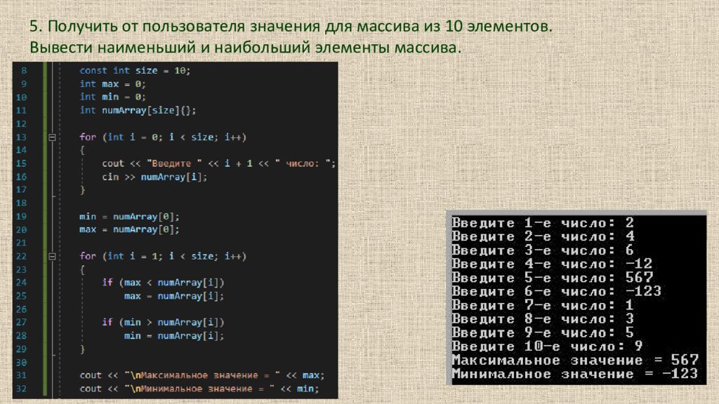 5. Получить от пользователя значения для массива из 10 элементов. Вывести наименьший и наибольший элементы массива.