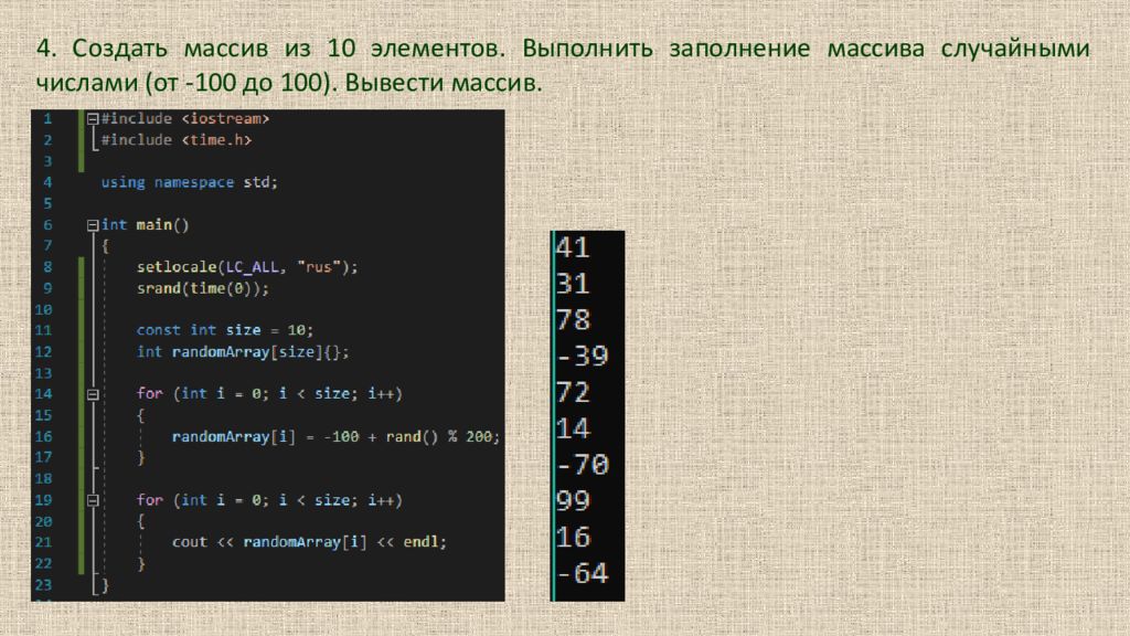 4. Создать массив из 10 элементов. Выполнить заполнение массива случайными числами (от -100 до 100). Вывести массив.