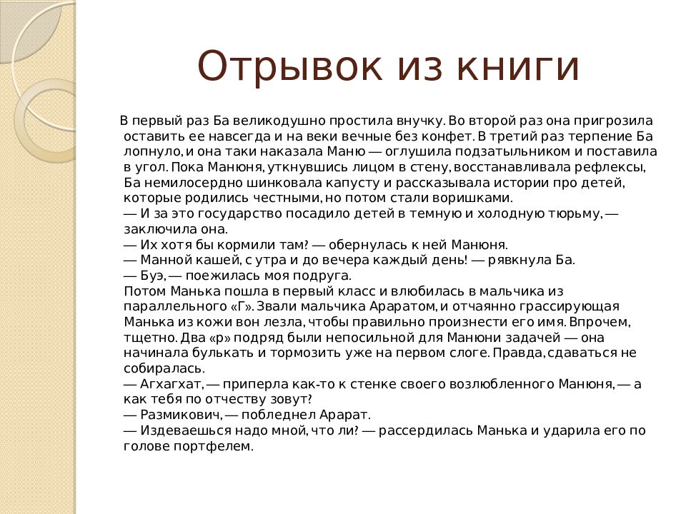 В первый раз Ба великодушно простила внучку. Во второй раз она пригрозила оставить ее навсегда и на веки вечные без конфет. В третий раз терпение Ба лопнуло, и она таки наказала Маню — оглушила подзатыльником и поставила в угол. Пока Манюня, уткнувшись лицом в стену, восстанавливала рефлексы, Ба немилосердно шинковала капусту и рассказывала истории про детей, которые родились честными, но потом стали воришками. — И за это государство посадило детей в темную и холодную тюрьму, — заключила она. — Их хотя бы кормили там? — обернулась к ней Манюня. — Манной кашей, с утра и до вечера каждый день! — рявкнула Ба. — Буэ, — поежилась моя подруга. Потом Манька пошла в первый класс и влюбилась в мальчика из параллельного «Г». Звали мальчика Араратом, и отчаянно грассирующая Манька из кожи вон лезла, чтобы правильно произнести его имя. Впрочем, тщетно. Два « р » подряд были непосильной для Манюни задачей — она начинала булькать и тормозить уже на первом слоге. Правда, сдаваться не собиралась. — Агхагхат, — приперла как-то к стенке своего возлюбленного Манюня, — а как тебя по отчеству зовут? — Размикович, — побледнел Арарат. — Издеваешься надо мной, что ли? — рассердилась Манька и ударила его по голове портфелем.