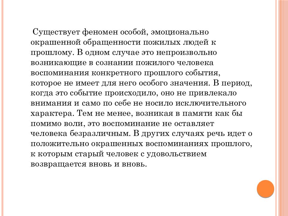 Существует феномен особой, эмоционально окрашенной обращенности пожилых людей к прошлому. В одном случае это непроизвольно возникающие в сознании пожилого человека воспоминания конкретного прошлого события, которое не имеет для него особого значения. В период, когда это событие происходило, оно не привлекало внимания и само по себе не носило исключительного характера. Тем не менее, возникая в памяти как бы помимо воли, это воспоминание не оставляет человека безразличным. В других случаях речь идет о положительно окрашенных воспоминаниях прошлого, к которым старый человек с удовольствием возвращается вновь и вновь.