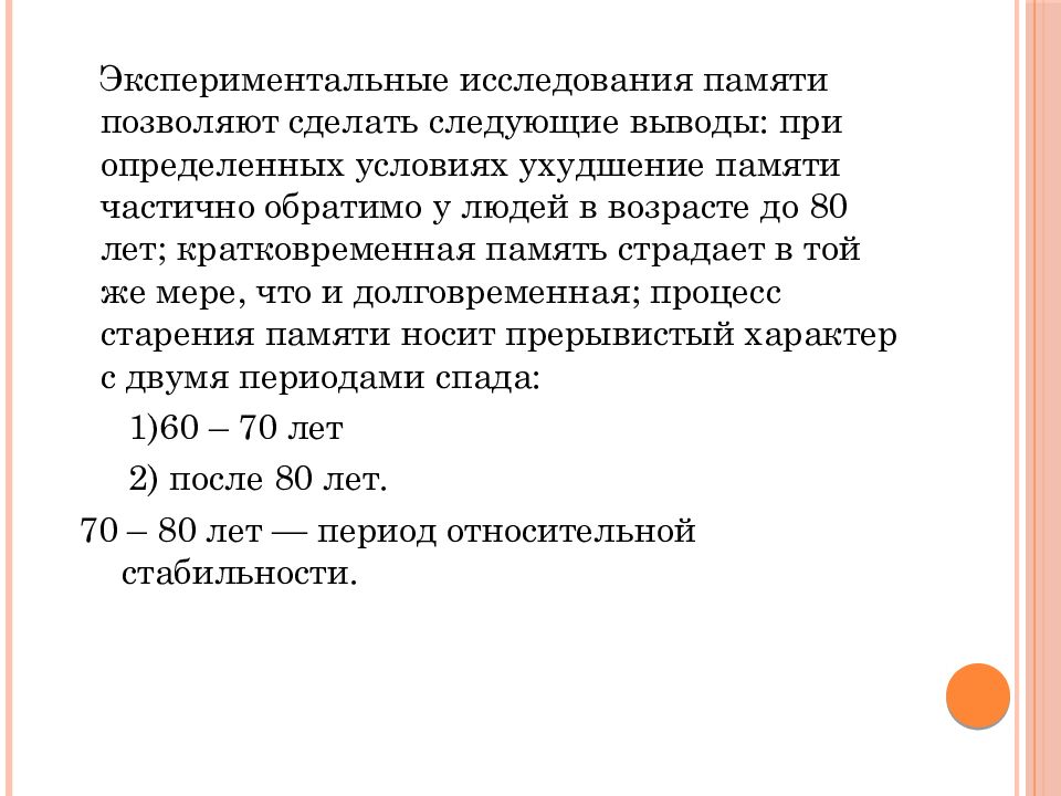 Экспериментальные исследования памяти позволяют сделать следующие выводы: при определенных условиях ухудшение памяти частично обратимо у людей в возрасте до 80 лет; кратковременная память страдает в той же мере, что и долговременная; процесс старения памяти носит прерывистый характер с двумя периодами спада: 1)60 – 70 лет 2) после 80 лет. 70 – 80 лет — период относительной стабильности.