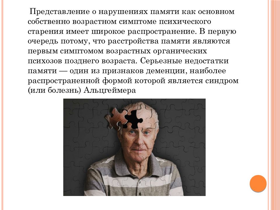 Представление о нарушениях памяти как основном собственно возрастном симптоме психического старения имеет широкое распространение. В первую очередь потому, что расстройства памяти являются первым симптомом возрастных органических психозов позднего возраста. Серьезные недостатки памяти — один из признаков деменции, наиболее распространенной формой которой является синдром (или болезнь) Альцгеймера