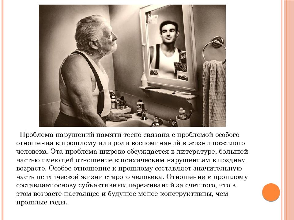 Проблема нарушений памяти тесно связана с проблемой особого отношения к прошлому или роли воспоминаний в жизни пожилого человека. Эта проблема широко обсуждается в литературе, большей частью имеющей отношение к психическим нарушениям в позднем возрасте. Особое отношение к прошлому составляет значительную часть психической жизни старого человека. Отношение к прошлому составляет основу субъективных переживаний за счет того, что в этом возрасте настоящее и будущее менее конструктивны, чем прошлые годы.
