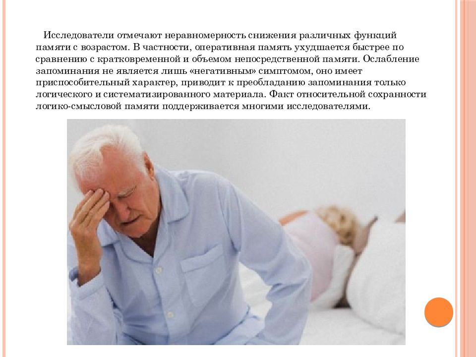 Исследователи отмечают неравномерность снижения различных функций памяти с возрастом. В частности, оперативная память ухудшается быстрее по сравнению с кратковременной и объемом непосредственной памяти. Ослабление запоминания не является лишь « негативным » симптомом, оно имеет приспособительный характер, приводит к преобладанию запоминания только логического и систематизированного материала. Факт относительной сохранности логико-смысловой памяти поддерживается многими исследователями.
