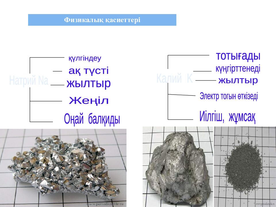 Натрий Na жылтыр ақ түсті Иілгіш, жұмсақ Электр тогын өткізеді тотығады қүлгіндеу Калий K Жеңіл Оңай балқиды күңгірттенеді жылтыр