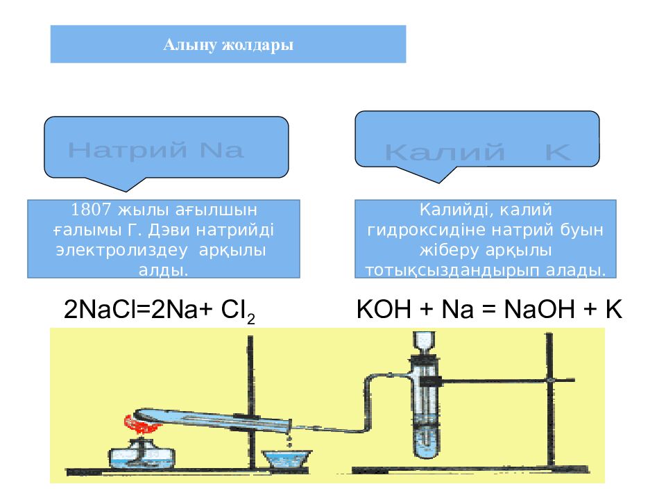 Натрий Na Калий K 2NaCl=2Na+ CI 2 KOH + Na = NaOH + K Калийді, калий гидроксидіне натрий буын жіберу арқылы тотықсыздандырып алады. 1807 жылы ағылшын ғалымы Г. Дэви натрийді электролиздеу арқылы алды. Алыну жолдары