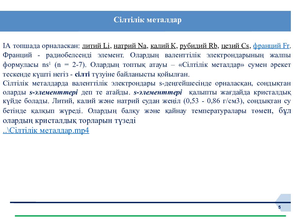 5 ІА топшада орналаскан: литий Li, натрий Na, калий К, рубидий Rb, цезий Cs, франций Fr. Франций - радиобелсенді элемент. Олардың валенттілік электрондарының жалпы формуласы ns 1 (n = 2-7). Олардың топтық атауы – «Сілтілік металдар» сумен әрекет тескенде күшті негіз - сілті түзуіне байланысты қойылған. Сілтілік металдарда валенттілік электрондары s-деңгейшесінде орналасқан, сондықтан оларды s-элементтері деп те атайды. s-элементтері қалыпты жағдайда кристалдық күйде болады. Литий, калий және натрий судан жеңіл (0,53 - 0,86 г/см 3 ), сондықтан су бетінде қалқып жүреді. Олардың балқу және қайнау температуралары төм ен, бұл олардың кристалдық торларын түзеді ..\Сілтілік металдар. mp4 Сілтілік металдар