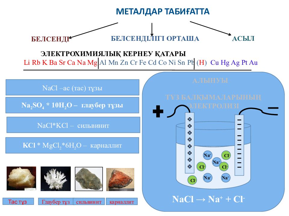 Металдар табиғатта Тас тұз Глаубер тұз сильвинит карналлит ЭЛЕКТРОХИМИЯЛЫҚ КЕРНЕУ ҚАТАРЫ Li Rb K Ba Sr Ca Na Mg Al Mn Zn Cr Fe Cd Co Ni Sn Pb ( H ) Cu Hg Ag Pt Au белсенді Белсенділігі орташа асыл NaCl – ас ( тас ) тұзы Na 2 SO 4 * 10H 2 O – глаубер тұзы NaCl * KCl – сильвинит KCl * MgCl 2 *6H 2 O – карналлит АЛЫНУЫ ТҰЗ БАЛҚЫМАЛАРЫНЫҢ ЭлектролизІ Na + Na + Na + Na + Cl - Cl - Cl - Cl - NaCl → Na + + Cl -