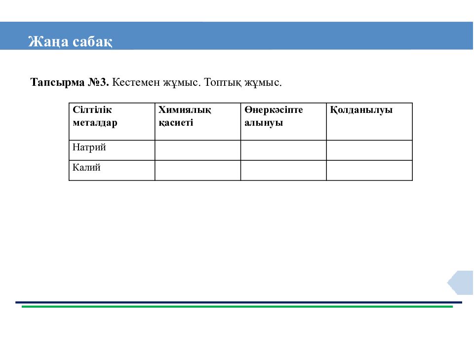 Жаңа сабақ Сілтілік металдар Химиялық қасиеті Өнеркәсіпте алынуы Қолданылуы Натрий Калий Тапсырма №3. Кестемен жұмыс. Топтық жұмыс.