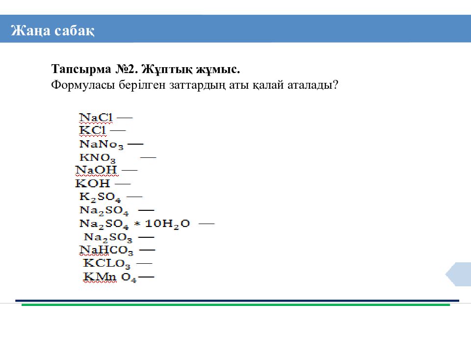 Жаңа сабақ Тапсырма №2. Жұптық жұмыс. Формуласы берілген заттардың аты қалай аталады?