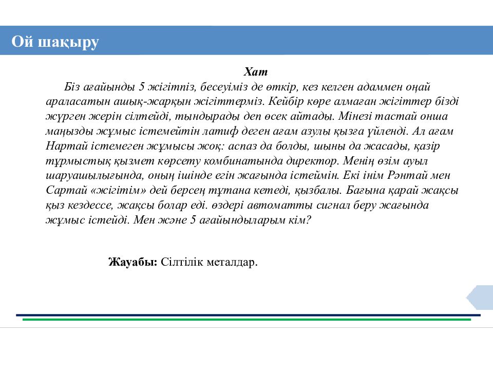Ой шақыру Хат Біз ағайынды 5 жігітпіз, бесеуіміз де өткір, кез келген адаммен оңай араласатын ашық-жарқын жігіттерміз. Кейбір көре алмаған жігіттер бізді жүрген жерін сілтейді, тындырады деп өсек айтады. Мінезі тастай онша маңызды жұмыс істемейтін латиф деген ағам азулы қызға үйленді. Ал ағам Нартай істемеген жұмысы жоқ: аспаз да болды, шыны да жасады, қазір тұрмыстық қызмет көрсету комбинатында директор. Менің өзім ауыл шаруашылығында, оның ішінде егін жағында істеймін. Екі інім Рәнтай мен Сартай «жігітім» дей берсең тұтана кетеді, қызбалы. Бағына қарай жақсы қыз кездессе, жақсы болар еді. өздері автоматты сигнал беру жағында жұмыс істейді. Мен және 5 ағайындыларым кім ? Жауабы: Сілтілік металдар.