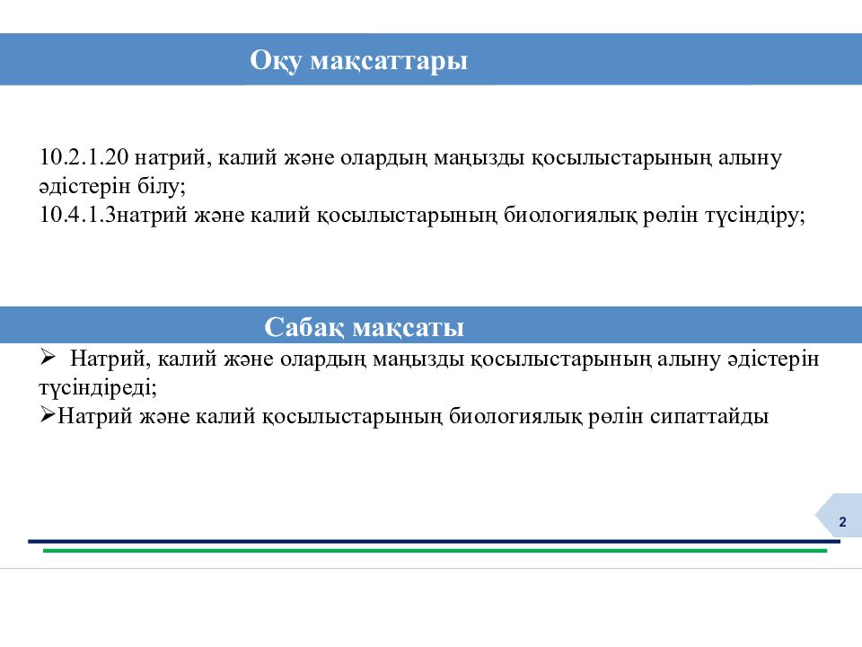 2 10.2.1.20 натрий, калий және олардың маңызды қосылыстарының алыну әдістерін білу; 10.4.1.3натрий және калий қосылыстарының биологиялық рөлін түсіндіру; Натрий, калий және олардың маңызды қосылыстарының алыну әдістерін түсіндіреді; Натрий және калий қосылыстарының биологиялық рөлін сипаттайды Оқу мақсат тар ы C абақ мақсаты