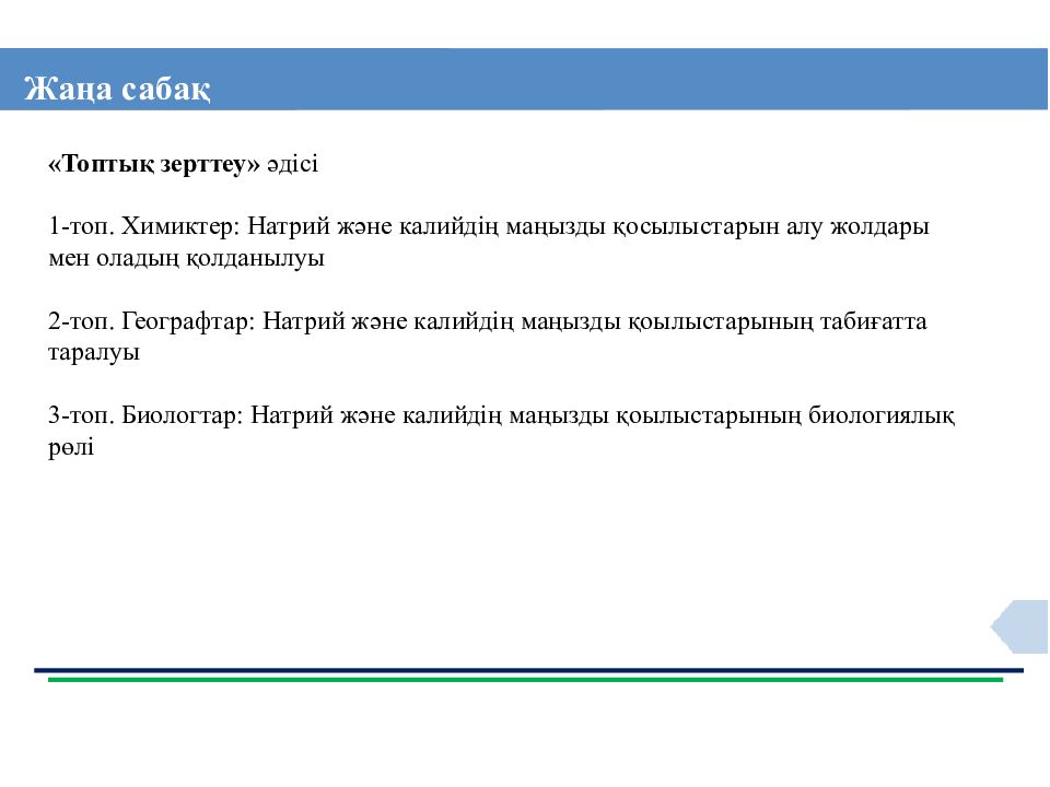 Жаңа сабақ «Топтық зерттеу» әдісі 1-топ. Химиктер: Натрий және калийдің маңызды қосылыстарын алу жолдары мен оладың қолданылуы 2-топ. Географтар: Натрий және калийдің маңызды қоылыстарының табиғатта таралуы 3-топ. Биологтар: Натрий және калийдің маңызды қоылыстарының биологиялық рөлі