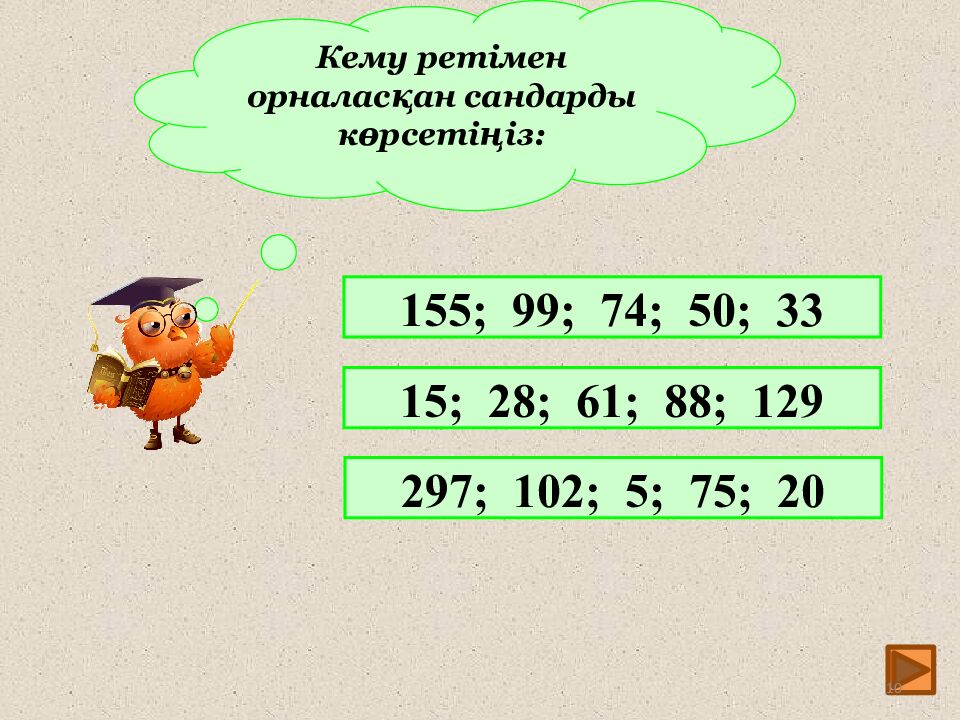 Кему ретімен орналасқан сандарды көрсетің із : 155; 99; 74; 50; 33 15; 28; 61; 88; 129 297; 102; 5; 75; 20 10