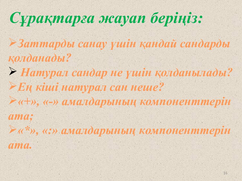 Сұрақтарға жауап беріңіз: Заттарды санау үшін қандай сандарды қолданады? Натурал сандар не үшін қолданылады? Ең кіші натурал сан неше? «+», «-» амалдарының компоненттерін ата; «*», «:» амалдарының к омпоненттерін ата. 16