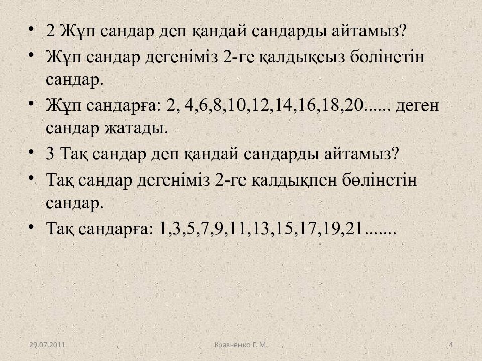 2 Жұп сандар деп қандай сандарды айтамыз? Жұп сандар дегеніміз 2-ге қалдықсыз бөлінетін сандар. Жұп сандарға: 2, 4,6,8,10,12,14,16,18,20...... деген сандар жатады. 3 Тақ сандар деп қандай сандарды айтамыз? Тақ сандар дегеніміз 2-ге қалдықпен бөлінетін сандар. Тақ сандарға: 1,3,5,7,9,11,13,15,17,19,21....... 29.07.2011 Кравченко Г. М. 4