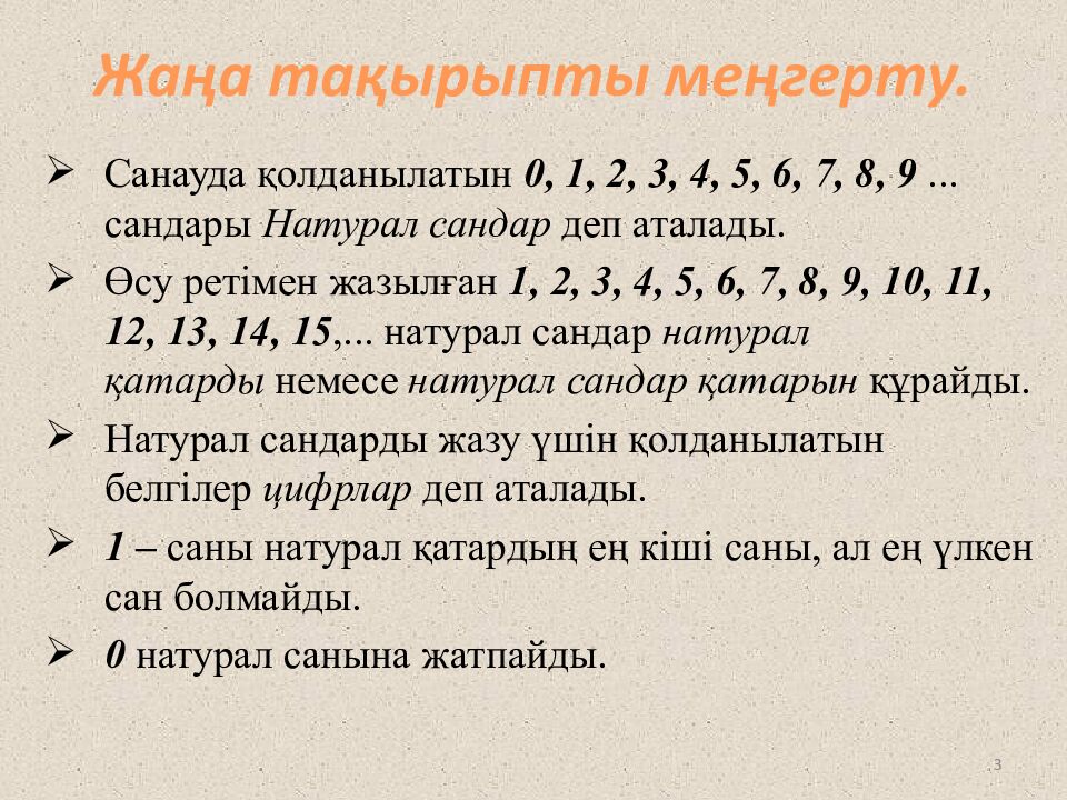 Санауда қолданылатын 0, 1, 2, 3, 4, 5, 6, 7, 8, 9... сандары Натурал сандар деп аталады. Өсу ретімен жазылған 1, 2, 3, 4, 5, 6, 7, 8, 9, 10, 11, 12, 13, 14, 15,... натурал сандар натурал қатарды немесе натурал сандар қатарын құрайды. Натурал сандарды жазу үшін қолданылатын белгілер цифрлар деп аталады. 1 – саны натурал қатардың ең кіші саны, ал ең үлкен сан болмайды. 0 натурал санына жатпайды. 3