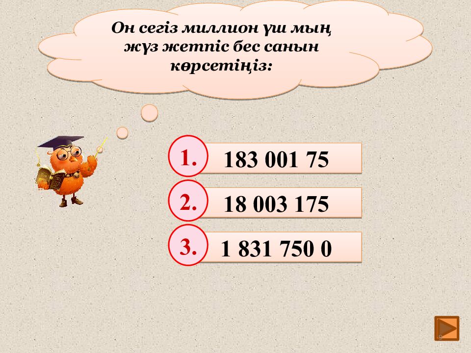 Он сегіз миллион үш мың жүз жетпіс бес санын көрсетіңіз : 183 001 75 18 003 175 1 831 750 0 1. 2. 3. 9