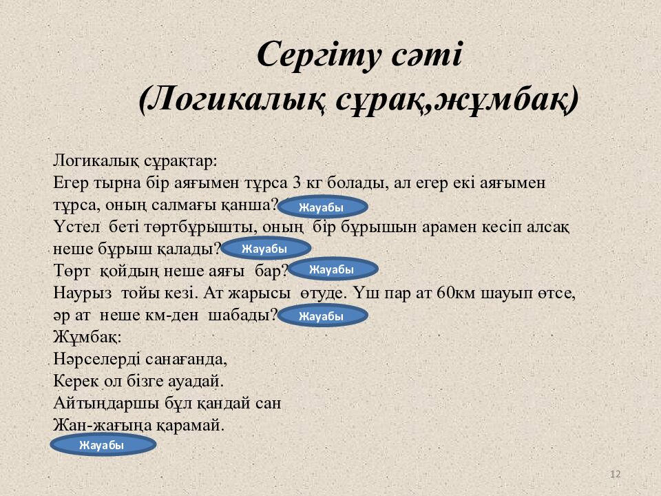 12 Логикалық сұрақтар: Егер тырна бір аяғымен тұрса 3 кг болады, ал егер екі аяғымен тұрса, оның салмағы қанша? (3кг) Үстел беті төртбұрышты, оның бір бұрышын арамен кесіп алсақ неше бұрыш қалады? 5 бұрыш Төрт қойдың неше аяғы бар? 16 аяқ Наурыз тойы кезі. Ат жарысы өтуде. Үш пар ат 60км шауып өтсе, әр ат неше км-ден шабады? 60 км Жұмбақ: Нәрселерді санағанда, Керек ол бізге ауадай. Айтыңдаршы бұл қандай сан Жан-жағыңа қарамай. Натурал сан Сергіту сәті (Логикалық сұрақ,жұмбақ) Жауабы Жауабы Жауабы Жауабы Жауабы
