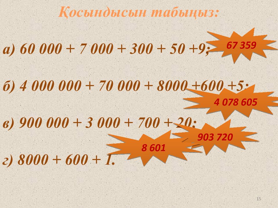 Қосындысын табыңыз: а) 60 000 + 7 000 + 300 + 50 +9; б) 4 000 000 + 70 000 + 8000 +600 +5; в) 900 000 + 3 000 + 700 + 20; г) 8000 + 600 + 1. 67 359 4 078 605 903 720 8 601 15
