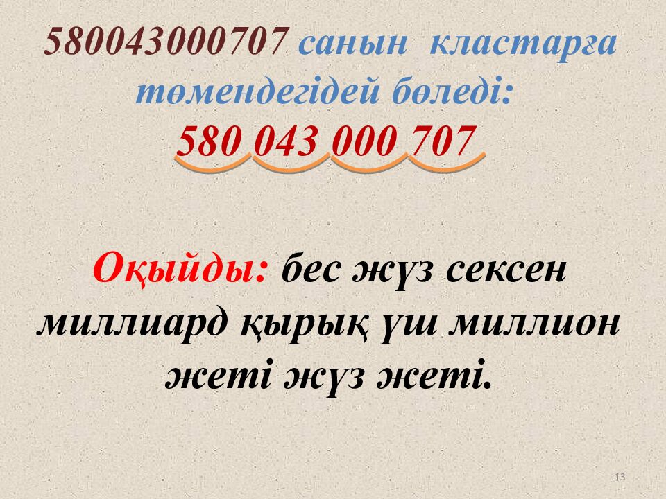 13 580043000707 санын кластарға төмендегідей бөледі : 580 043 000 707 Оқыйды: бес жүз сексен миллиард қырық үш миллион жеті жүз жеті.