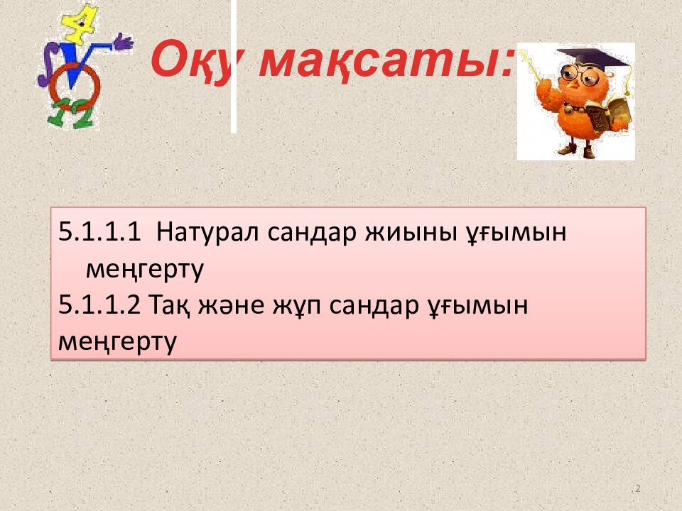 Оқу мақсаты: 2 5.1.1.1 Натурал сандар жиыны ұғымын меңгерту 5.1.1.2 Тақ және жұп сандар ұғымын меңгерту