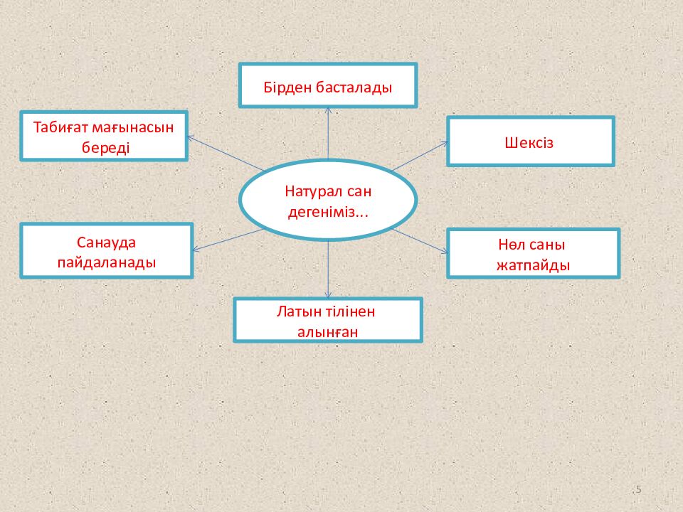 5 Натурал сан дегеніміз... Бірден басталады Латын тілінен алынған Нөл саны жатпайды Санауда пайдаланады Шексіз Табиғат мағынасын береді
