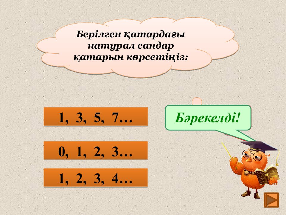Берілген қатардағы натурал сандар қатарын көрсетіңіз: 0, 1, 2, 3… 1, 2, 3, 4… 1, 3, 5, 7… Ойлан ! Бәрекелді! 7