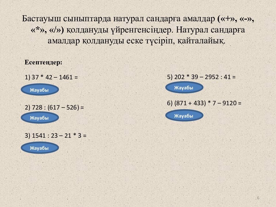 6 Бастауыш сыныптарда натурал сандарға амалдар («+», «-», «*», «/») қолдануды үйренгенсіңдер. Натурал сандарға амалдар қолдануды еске түсіріп, қайталайық. Есептеңдер: 1) 37 * 42 – 1461 = 93 Жауабы 2) 728 : (617 – 526) = 8 Жауабы 3) 1541 : 23 – 21 * 3 = 4 Жауабы 5) 202 * 39 – 2952 : 41 = 7806 Жауабы 6) (871 + 433) * 7 – 9120 = 8 Жауабы