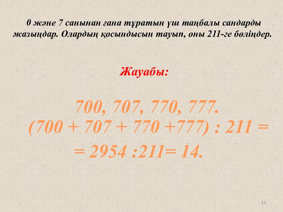 0 және 7 санынан ғана тұратын үш таңбалы сандарды жазыңдар. Олардың қосындысын тауып, оны 211-ге бөліңдер. Жауабы : 700, 707, 770, 777. (700 + 707 + 770 +777) : 211 = = 2954 :211= 14. 14