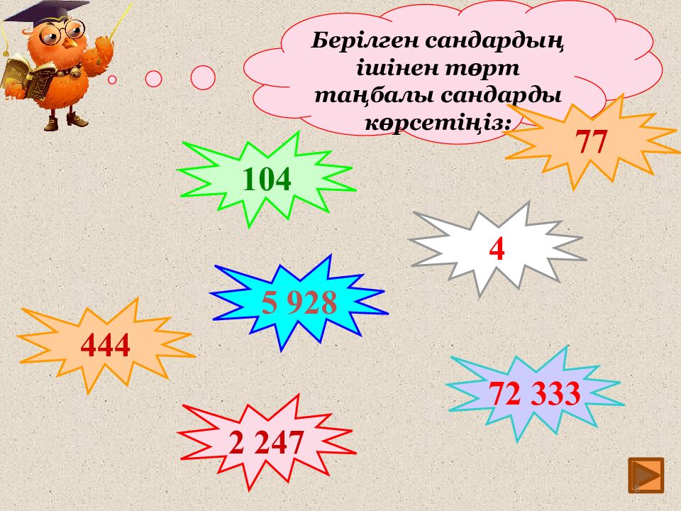 Берілген сандардың ішінен төрт таңбалы сандарды көрсетіңіз: 444 104 5 928 2 247 72 333 77 4 8