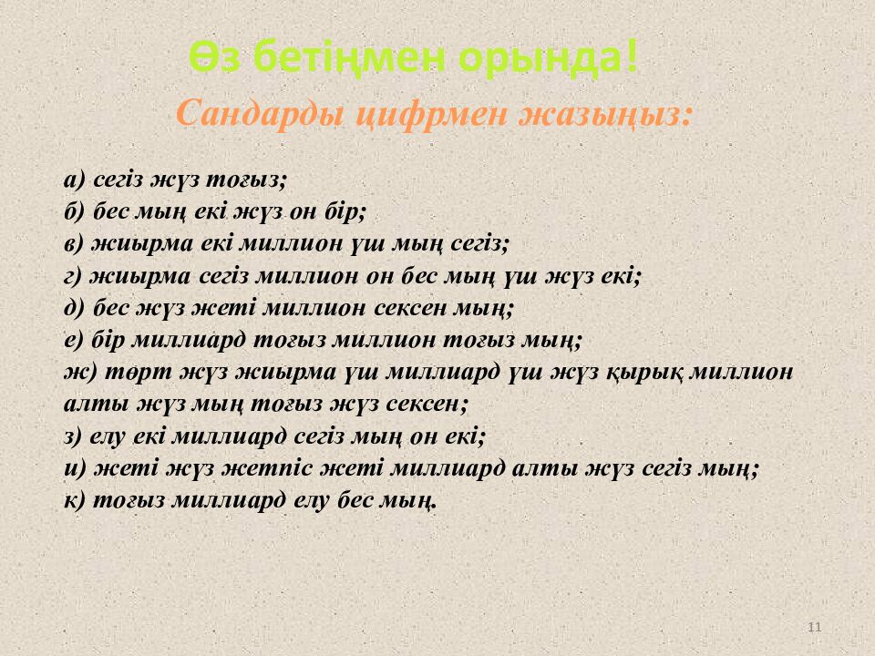 Өз бетіңмен орында ! а) сегіз жүз тоғыз ; б) бес мың екі жүз он бір ; в ) жиырма екі миллион үш мың сегіз ; г) жиырма сегіз миллион он бес мың үш жүз екі ; д ) бес жүз жеті миллион сексен мың ; е) бір миллиард тоғыз миллион тоғыз мың ; ж) төрт жүз жиырма үш миллиард үш жүз қырық миллион алты жүз мың тоғыз жүз сексен ; з ) елу екі миллиард сегіз мың он екі ; и) жеті жүз жетпіс жеті миллиард алты жүз сегіз мың ; к) тоғыз миллиард елу бес мың. Сандарды цифрмен жазыңыз: 11