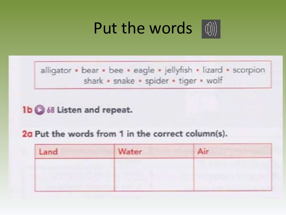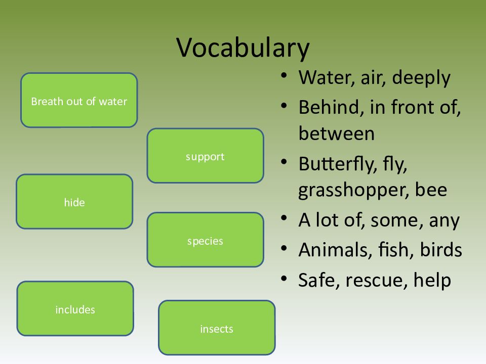 Water, air, deeply Behind, in front of, between Butterfly, fly, grasshopper, bee A lot of, some, any Animals, fish, birds Safe, rescue, help Breath out of water support hide species includes insects