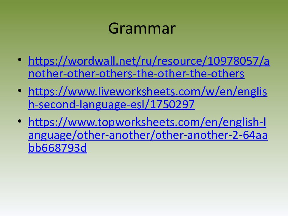 https://wordwall.net/ru/resource/10978057/another-other-others-the-other-the-others https://www.liveworksheets.com/w/en/english-second-language-esl/1750297 https://www.topworksheets.com/en/english-language/other-another/other-another-2-64aabb668793d