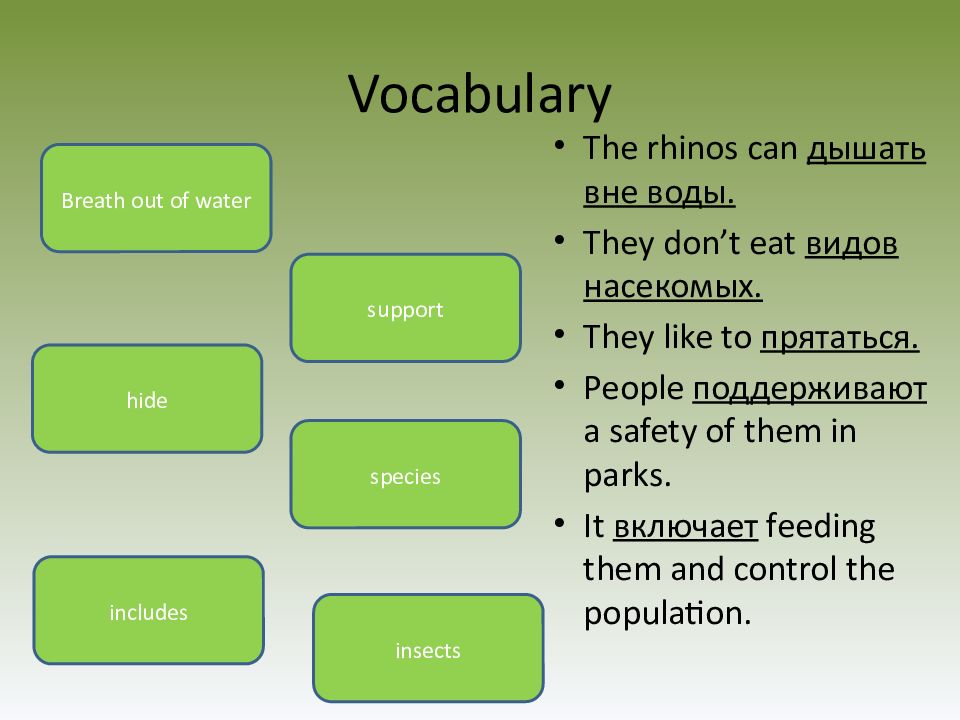 The rhinos can дышать вне воды. They don’t eat видов насекомых. They like to прятаться. People поддерживают a safety of them in parks. It включает feeding them and control the population. Breath out of water support hide species includes insects