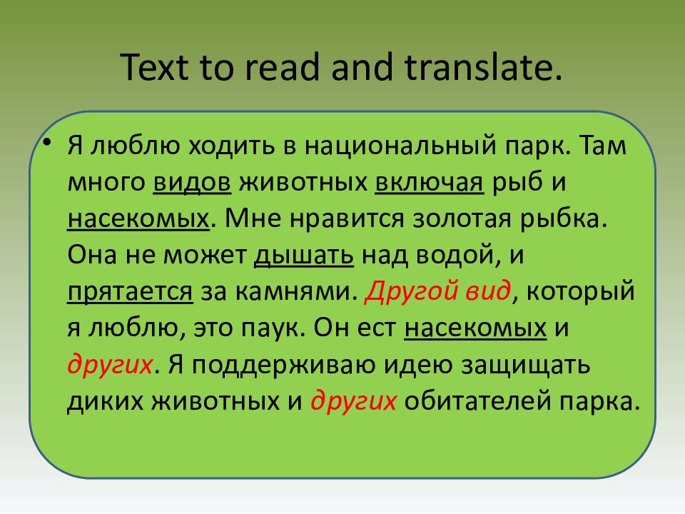 Я люблю ходить в национальный парк. Там много видов животных включая рыб и насекомых. Мне нравится золотая рыбка. Она не может дышать над водой, и прятается за камнями. Другой вид, который я люблю, это паук. Он ест насекомых и других. Я поддерживаю идею защищать диких животных и других обитателей парка.