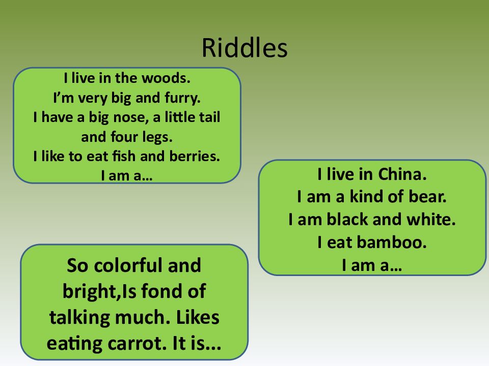 I live in the woods. I’m very big and furry. I have a big nose, a little tail and four legs. I like to eat fish and berries. I am a… So colorful and bright,Is fond of talking much. Likes eating carrot. It is... I live in China. I am a kind of bear. I am black and white. I eat bamboo. I am a…