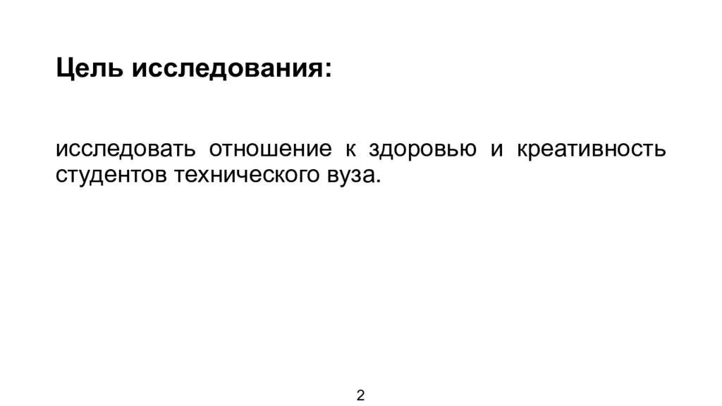 Предмет исследования: студенты технического вуза разных направлений профессиональной подготовки, занимающиеся и не занимающиеся творческой деятельностью. отношение к здоровью (когнитивный, эмоциональный, поведенческий, ценностно-мотивационный компоненты) и креативные характеристики (оригинальность и уникальность; уровень креативного потенциала) студентов технического вуза; связи и различия между показателями. 3