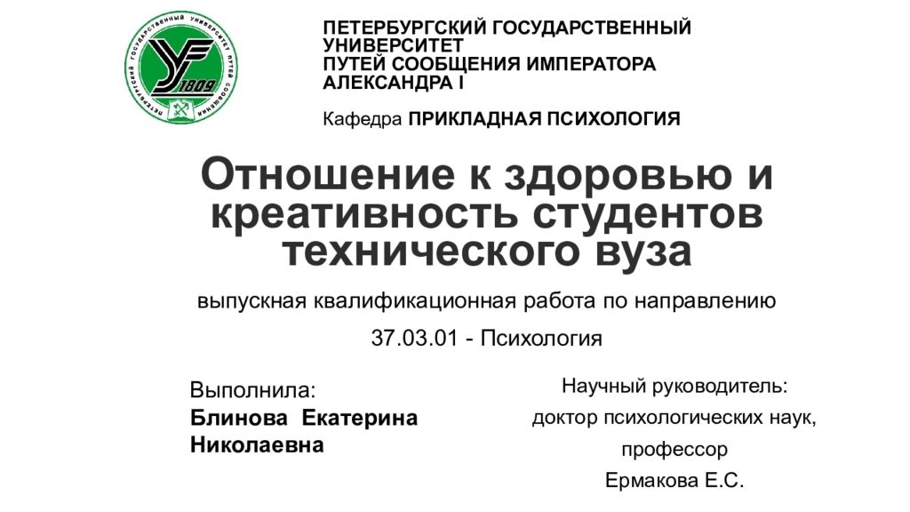 Научный руководитель: доктор психологических наук, профессор Ермакова Е.С. ПЕТЕРБУРГСКИЙ ГОСУДАРСТВЕННЫЙ УНИВЕРСИТЕТ ПУТЕЙ СООБЩЕНИЯ ИМПЕРАТОРА АЛЕКСАНДРА I Кафедра ПРИКЛАДНАЯ ПСИХОЛОГИЯ Отношение к здоровью и креативность студентов технического вуза выпускная квалификационная работа по направлению 37.03.01 - Психология Выполнила: Блинова Екатерина Николаевна
